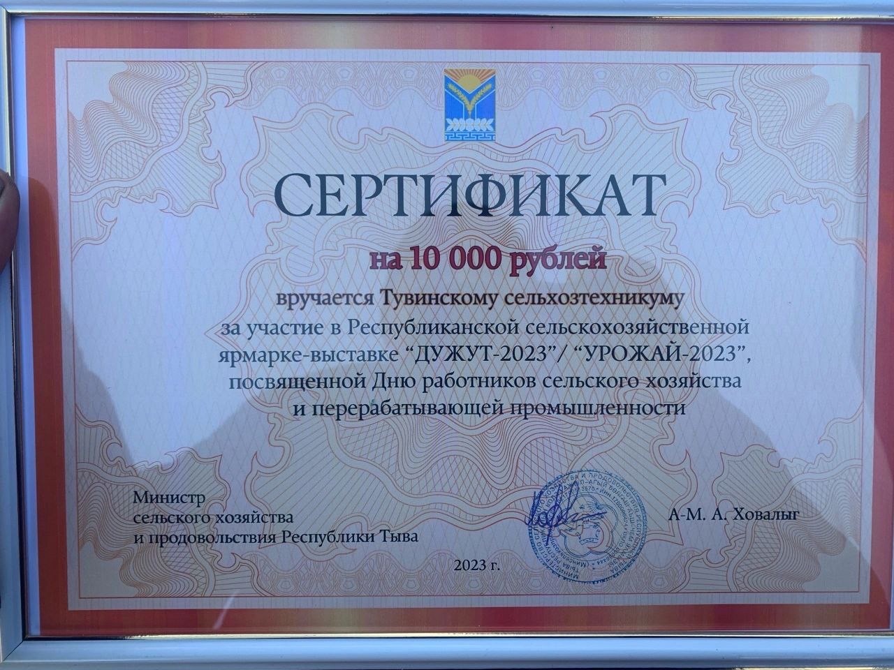 🟡По итогам работы ярмарки от Министерства сельского хозяйства Республики Тыва нашим техникумам вручены сертификаты на сумму 10 000 рублей. Благодарим за поддержку и сотрудничество! С праздником!